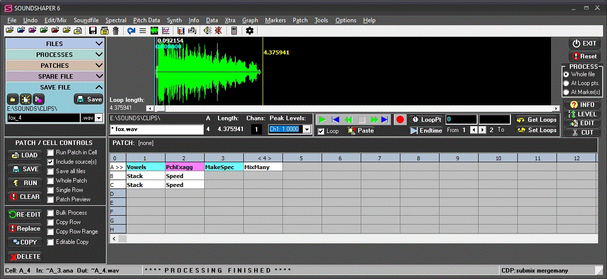 When run, processes are displayed in a table called the Patch Grid. Soundshaper patches are an easy way to store and recall whole sequences of CDP processes in a fully editable form. All values are retained and the patch can be re-run with any source. Soundshaper patches support up to 16 separate process chains, which can come from different sources. Soundshaper also supports bulk processing, presets and multiple parameter sets.