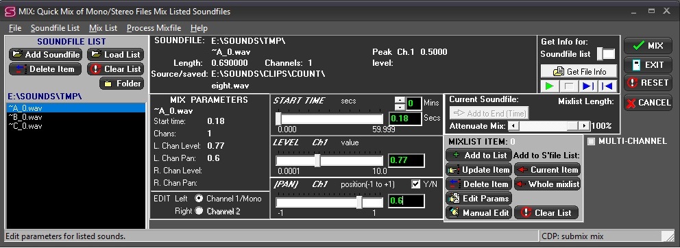 Soundshaper has a dedicated Mix Page for creating and editing Mixfiles. In this screenshot, mix parameters are set for sounds pre-selected on the Main Page and the mix is run without any need to understand the CDP mixfile format: