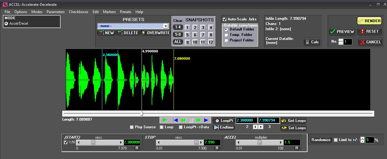 Soundshaper now supports up to 100 markers (cue points) on the Main and Parameter Pages. New Markers are placed from selected Loop or Play-cursor points in the soundfile display. Markers have many uses: playing or processing selected portions of a soundfile or creating time-points for breakpoint data files. On the Main page, you can use Markers or Loops to transform an edited selection of the soundfile. You can save a set of Markers, or import those saved from an external program such as Audacity.